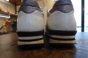 今回の様なスニーカーはこのように「コーナーハーフ」という修理メニューで部分的的に補強をします。 さほど違和感なく仕上がり、 靴のバランスが整います。
