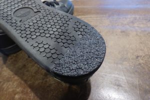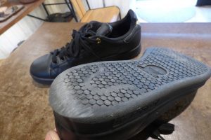 「コーナーハーフ」という修理メニューで部分補強をしました。 どうしても繋ぎ目は出来てしまいますが、さほど違和感はありません。 これで安心して履いていただけます。店頭だけでなく郵送でも修理をお受けしています。