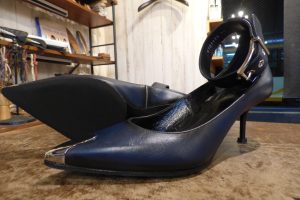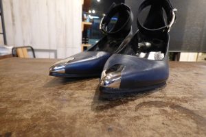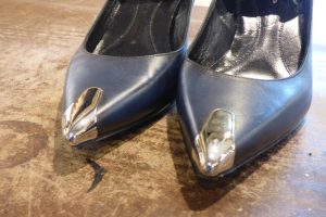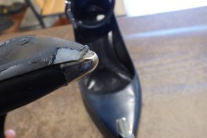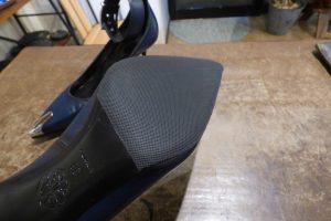 レザーソールのつま先部は擦れにより無くなっているので、この部分は「革で埋めて」形を戻したあと、ソールを補強します。