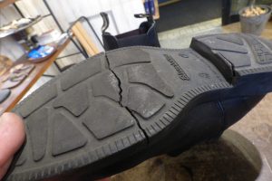 靴底の修理のご依頼です。 ウレタン素材の一体型ソールが「加水分解」による経年劣化が始まり、割れている状態です。