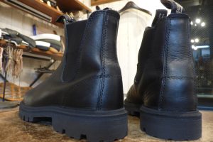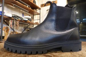 ウェルトを巻き、「ラバーミッドソール」を挟んで靴本体とマッケイ縫いで縫い、100ソールを接着している構造です。 靴の雰囲気とも合い、お客様にも大変喜んでいただけました。