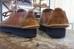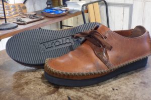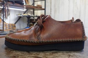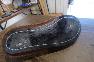 元のクレープを除去し、「3mm厚のラバーミッドソール」を貼り、靴本体とマッケイ縫いで縫いました。