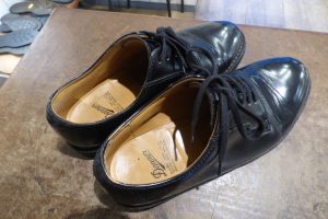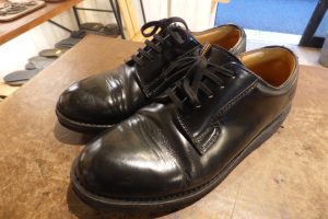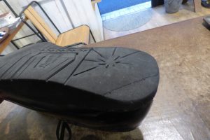 靴底の修理のご依頼です。 純正のスポンジソールのソール中心部、 カカトが擦り減ってるので「オールソール交換(靴底全体交換)」をご希望されました。 過去に様々な内容でソール交換をしており、普段は今の厚みがあるスポンジミッドソールを除去し、3mm厚のレザーミッドソールかラバーミッドソールで交換をして土台を作りますが、今回は元のミッドソールを残して修理をします。 店頭のソールサンプルをご覧いただき、お客様好みに加工をさせていただきます。 <after>