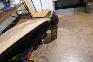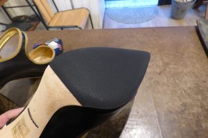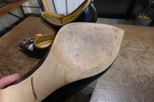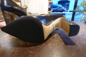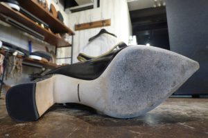 擦り減っているつま先部は「革で埋めて」厚みを戻し、