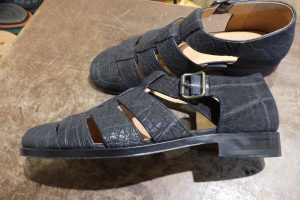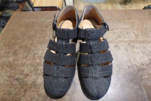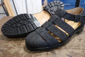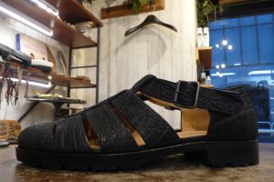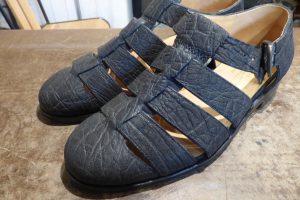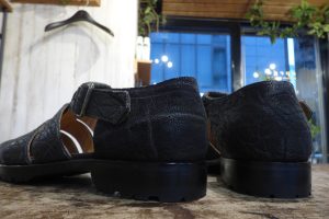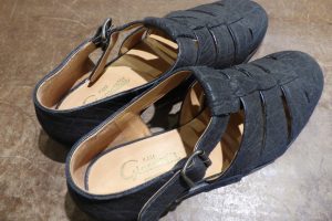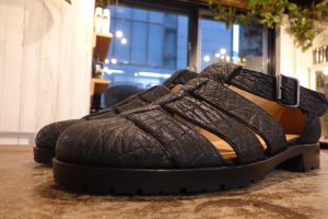 アッパーは「エレファントレザー(象革)」でジャコメッティらしい個性的なサンダルです。