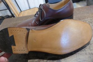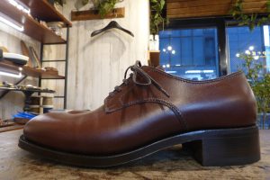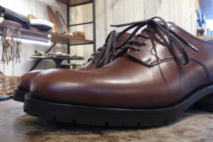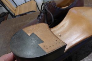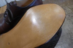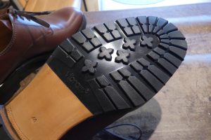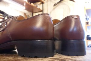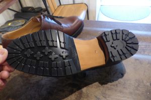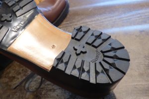 レザーソールは残し、ソールとカカトをそれぞれカスタム補強をしました。 ビブラム社のタンク型ハーフラバーと トップリフトです。