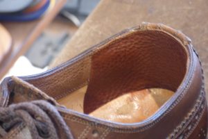 なので「カウンターライニング」という修理メニューで革をあてて縫い、補強をします。 今回は元のレザーと質感、色味が近いものを使用しました。 これで安心して履いていただけます。店頭だけでなく郵送でも修理をお受けしています。