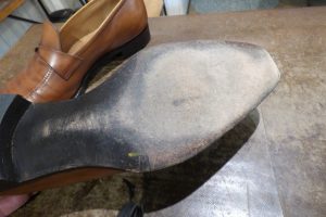 このままで履かれても問題はありませんが、今後ソール交換をしないのをご希望で、 「ハーフラバー」で地面との接地面を補強させていただきました。