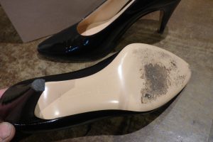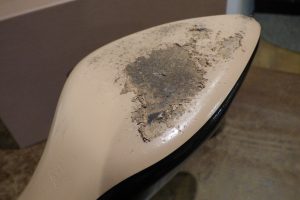 レザーが固いアスファルトと擦れると塗装が剥げるのは自然なことなので問題はありませんが、このまま履かれるとダメージが広がるのと、靴が滑るので