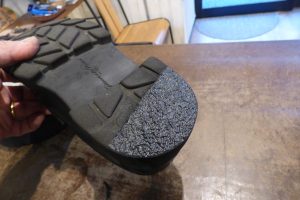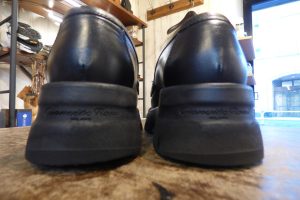 一体型ソールで カカトの擦り減りを気にされ、この度は修理のご依頼です。 バランスが整うように 「コーバーハーフ」という修理メニューで部分的に補強をしました。 どうしても繋ぎ目は出来ますが、 バランスが安定し、 これで安心して履いていただけます。店頭だけでなく郵送でも修理をお受けしています。