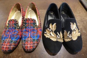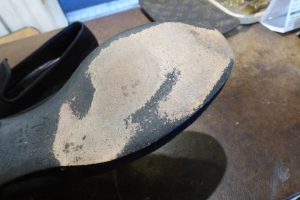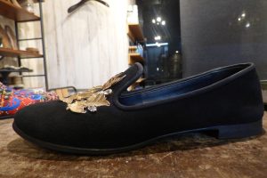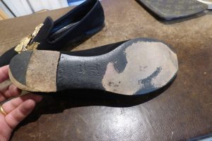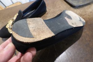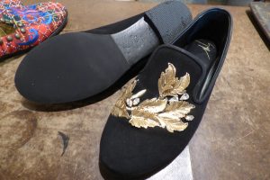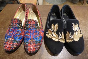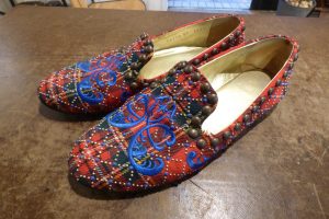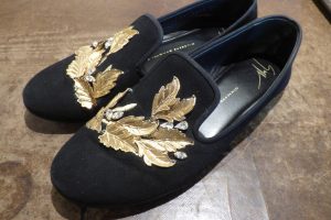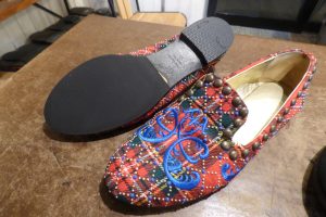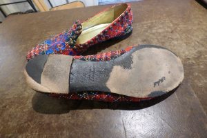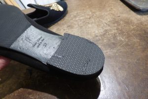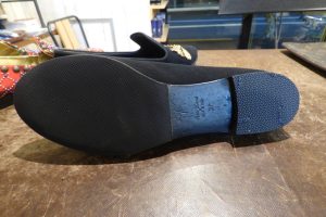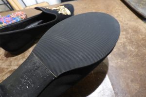 Giuseppe Zanotti(ジュゼッペ ザノッティ)のレディースシューズを2足お持ちくださいました。 鮮やかな装飾のスエードスリッポンです。 靴底の修理のご依頼です。 レザーソールのままで履かれているので補強をし、 カカトはトップリフトを超えてすり減っているので、「革で埋めて」交換修理をします。 もう1足はテキスタイルに刺繍の装飾です。 全く同じ状態なので、 <after>