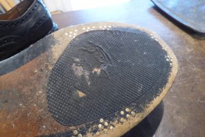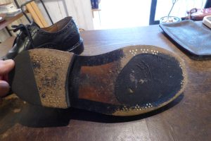 重厚感がいいですね。 靴底の修理のご依頼です。 純正のレザーソールの上に 既製品のハーフラバーが剥がれている状態です。