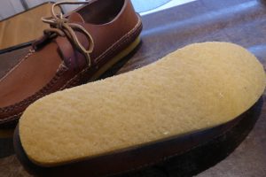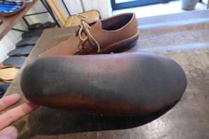 クレープのミッドソールを作り、靴本体と「マッケイ縫い」で縫い、土台を作りました。 これで剥がれの心配はなくなり、 クレープのアウトソールを接着しました。 靴の雰囲気とも合いますね。 実用的な仕様になります。 このタイプの靴は基本、ヒールを付けずフラットに加工をします。 これで安心して履いて頂けます。店頭だけでなく郵送でも修理をお受けしています。