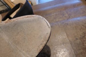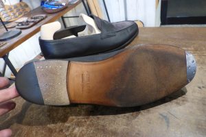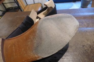 擦り減っているつま先を「革で埋めて」厚みを戻した後、