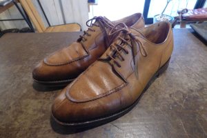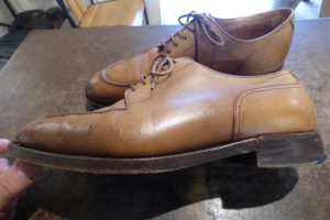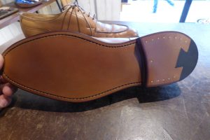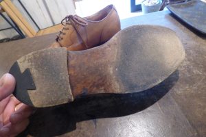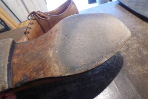 長年ご愛用されている靴で、レザーソール中心部にはまだ穴は開いていませんが、薄くなっているのと