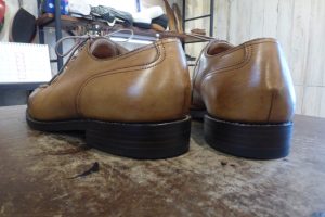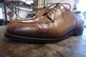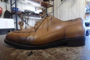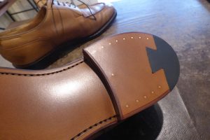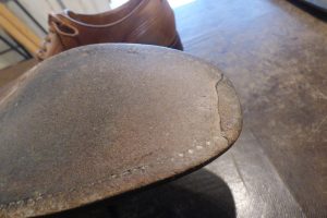 元のようにスペードソールでの加工は可能ですが、つま先の擦り減りが早いので、あえてミッドソールを挟まずにシングルソールでソール交換をさせて頂きました。