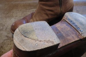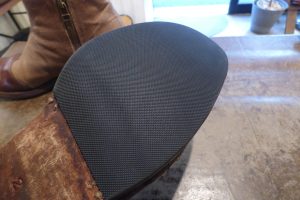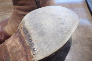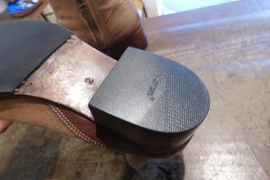 トップリフトの交換に加え、積み上げ部は「革で埋めて」厚みを戻します。レザーソール前部はあらかじめハーフレザーソールが付いている構造です。今以上擦り減らないように補強をします。