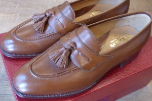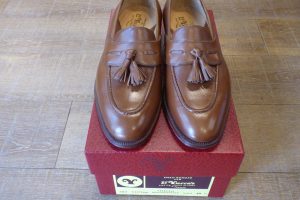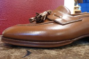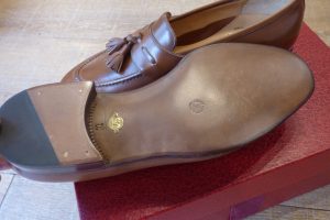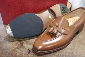 靴を大切にされている方が関東圏以外のご遠方からもお越しいただくケースが多く、大変嬉しく思います。 上質なカーフ&捻りがあるデザインのタッセルローファーがレユッカスらしくいい感じです。 履かれる前の新品状態でお持ちくださり、靴底の補強のご依頼です。 前半分「ハンドソーンウェルト製法」です。