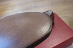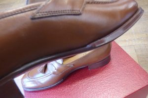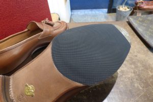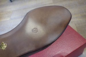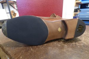 ウエスト部など手作業の加工も多く、既成靴では最高峰の作りだと思います。 お客さまは仕上がりのイメージをしっかりとお持ちで、 お客さま好みに加工をさせて頂きます。 耐久性がある仕様で補強をさせていただきました。 地面との接地面を「ハーフラバー」で補強をしました。