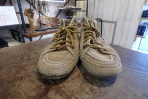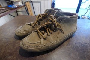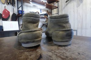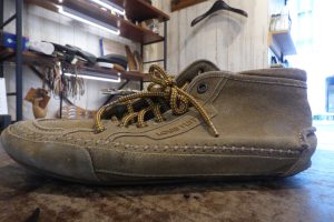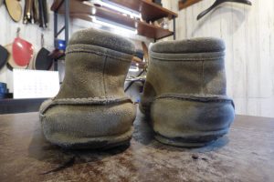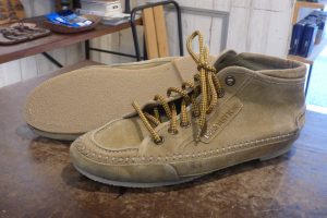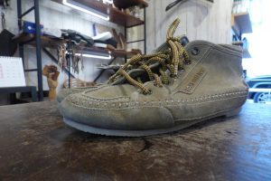 合成クレープソールのアメ色を使用し、剥がれないように「マッケイ縫い」で縫っています。