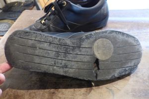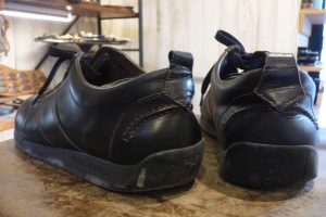 靴底のウレタン素材のソールが「加水分解」による経年劣化でボロボロ崩れています。