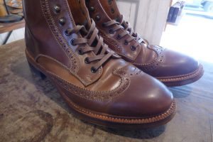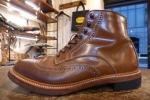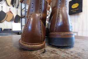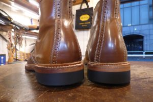 MAKERS(メイカーズ)をお持ちくださいました。 アッパーは希少なウィスキーコードバンです。 しかも面積があるブーツで使用されているので贅沢な1足と思います。 靴底の修理のご依頼です。 右足は問題がない状態です。 この復刻のトップリフトは当店でも以前取り扱いしていましたが、現在は廃盤の為、入手困難になります。 右足のカカトは無くなっている状態です。 歩いているといつの間にか無くなっていたとの事です。 なので両足とも新しいカカトに交換をします。 <after>