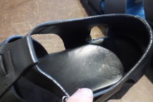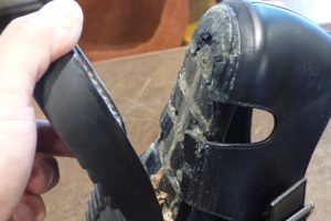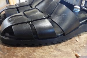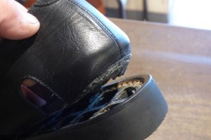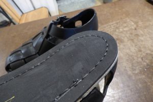 お客様にご説明すると、多少リスクがあっても良いので、今後靴底が剥がれずストレスがないように加工をしたいとのことでした。その為には「マッケイ製法」に変更をし、靴底を縫うようにする必要があります。ただ、このグルカサンダルは中底の表面にロゴ入りのレザーが巻いてある構造になります。