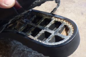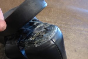 靴の損傷部分はいつも同じで、修理方法も毎度悩まされる靴になります。靴底の修理のご依頼です。まださほど擦り減ってはいないパラブーツ純正ソールです。