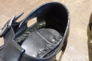 マッケイ縫いで縫うとこの箇所にステッチが入るのが大きなデメリットですが、お客様は気にならないとの事で、この度は実用的な仕様に加工をさせていただく事となりました。元のソールを除去し、黒く染めたレザーウェルトを巻きました。そして3mm厚の「黒のラバーミッドソール」を貼り、靴本体と1周、マッケイ縫いで縫いました。ミッドソールの土台に縫いをかけることで、今後は以前のように靴が分解することはありません。お話通り中敷き部分に縫い目が出来ます。黒い靴に黒ステッチなのでまだ比較的目立ちにくいですが、明るい色味の靴だと目につきます。ステッチ痕を隠すのをご希望の場合は、parabootのロゴが無くなっても宜しければ、この上からレザーを1枚張ることも出来ます。<after>