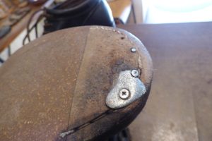 純正のヴィンテージスティールが欠けて無くなっているので、「つま先部のレザーを埋めて」から補強をします。
