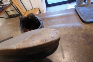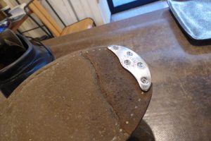 擦り減っているレザー部分を「革で埋めて」厚みを戻した後、再度スティールを取りつけます。