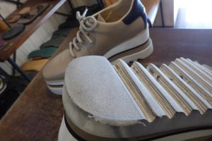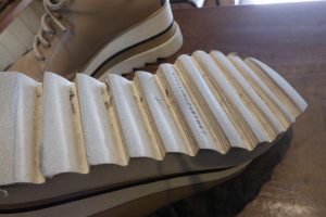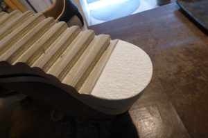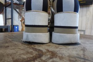 「コーナーハーフ」という修理メニューで部分補強をします。 補強した箇所のスポンジは、靴本体のスポンジより耐久性があるので、以前よりカカトが長持ちします。 バランスが整い安心して履いていただけます。店頭だけでなく郵送でも修理をお受けしています。