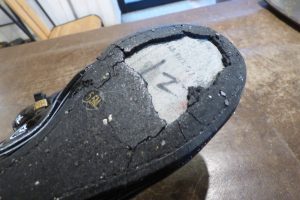 このままでは履けないので「オールソール交換」で靴底全体を作り変える必要があります。
