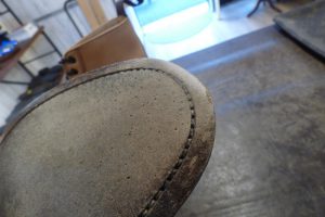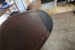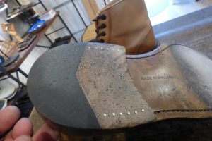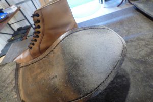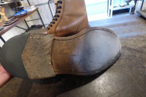 つま先は金属製の「ヴィンテージスティール」を使用する機会が多いのですが、おきゃくさまはあまりお好みではないとの事で、「つま先ラバー」で補強をしました。 これで安心して履いていただけます。