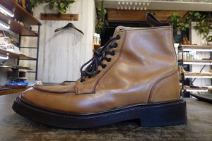 Tricker,s(トリッカーズ)のメンズブーツをお持ちくださいました。 カントリーブーツをお預かりする機会が多いトリッカーズですが、このUチップの雰囲気もいいですね。 靴底の修理のご依頼です。 純正のレザー&ラバーの「アローヘッド」ですが、擦り減ってきているので今より滑らない仕様での交換をご希望されました。 レザーソールの履き心地はお好みとの事で、補強はせずに、 擦り減っているつま先部のみを補強します。 <after>