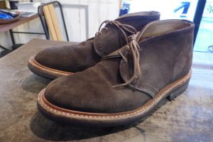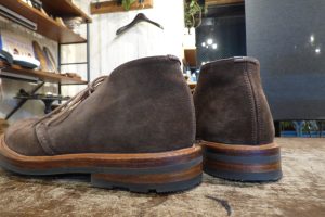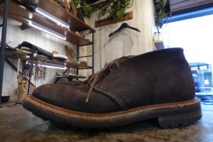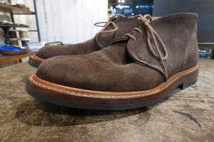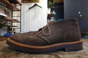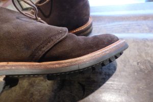 Tricker,s(トリッカーズ)のスエードチャッカブーツをお持ちくださいました。 いい雰囲気ですね。 この度は靴底の修理のご依頼です。 おなじイギリスのラバーソール「コマンドソール」が使用されていますが、 ラバーソールが屈曲部で横に割れている状態でした。