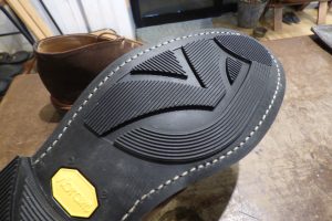 お選びいただいたのは「ビブラム2870ソール」です。 当店ではパラブーツのソール交換で使用頻度が多いです。 元の厚みがあるレザーミッドソールは残せたので、今回はアウトソールのみ交換をしました。 靴の雰囲気とも合いますね。 ヒール部はレザーを積み上げ成形します。 これで安心して履いていただけます。店頭だけでなく郵送でも修理をお受けしています。