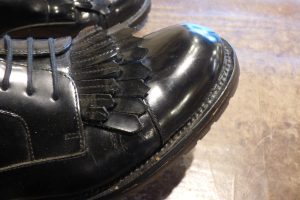 上から見えるウェルトの縫いはダミーになるので、今後剥がれないように加工をし直します。