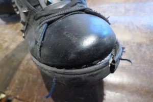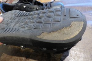 カカトが深く擦り減り、 ソール前部はステッチが切れて割れが見られます。