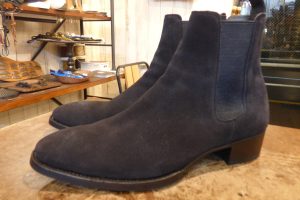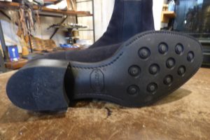 WH(ダブルエイチ)のサイドゴアブーツを岩手県よりお持ちくださいました。 スエードのサイドゴアブーツになります。まだ1度履かれたのみの綺麗な状態です。 靴の構造自体は「グッドイヤーウェルト製法」です。 「ビブラム2055」のラバーソールが使用されており ラバーソールの前半分はグッドイヤーウェルトの「出し縫い」で縫われ、 ウエスト部は「マッケイ製法」で縫われています。
