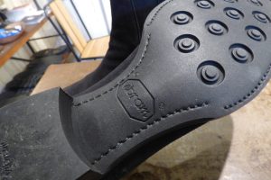 仕事柄、様々なメーカーの靴を触るので日本のどこの工場で製造されたかは大体想像がついてしまいます。 カカトは「ビブラム5350」のラバートップリフトが使用されています。 一般的なサイドゴアブーツよりヒールがだいぶ高く設計されているので、お客様は靴を履くと前のめりになりとても疲れるとご相談を頂きました。 6mm厚のトップリフトに、5mm厚のレザーの積み上げが6枚です。